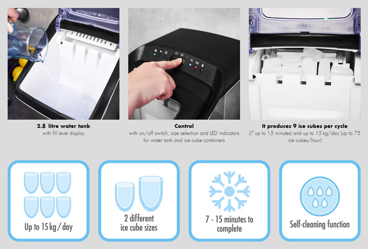 کشور مبدا: آلمان مونتاژ چین/ توان مصرفی: 145 وات/ ظرفیت مخزن آب: 2.8 لیتر/ تولید 9 گلوله یخ در هر بار/ ساخت یخ در دو سایز 11 و 27 میلی متر/ حداکثر میزان تولید یخ: 15 کیلوگرم در یک روز