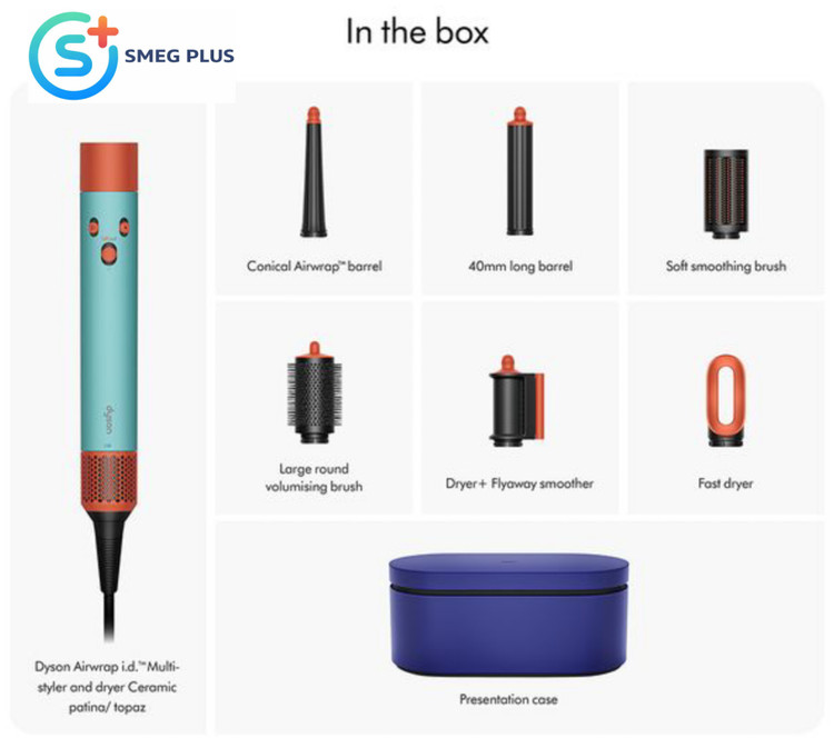 | اقلام همراه | سری Fast dryer / سری مخروطی Conical Airwrap barrel / سری 40میلیمتری Airwrap Long baller / سری Dryer+Flyaway smoother / سری Soft smoothing brush / سری Large round volumizing brush/ برس تمیز کننده فیلتر / کیف جیر مخصوص Dyson |