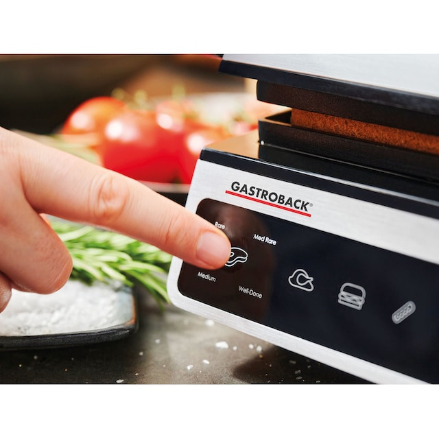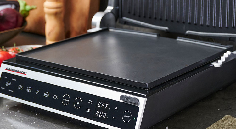 گریل باربیکیو gastroback 42542 از نوع رومیزی و تاشو، با طراحی شیک و ابعاد جمع و جور در هر آشپزخانه و گوشه حیاط می درخشد. این مدل از 2 صفحه گریل، پایینی از نوع تخت (صاف) و صفحه بالایی از نوع شیاردار می باشد. البته صفحات گریل بالایی و پایینی به راحتی قابل تعویض بوده و ارتفاع صفحه بالایی نیز قابل تنظیم می باشد.