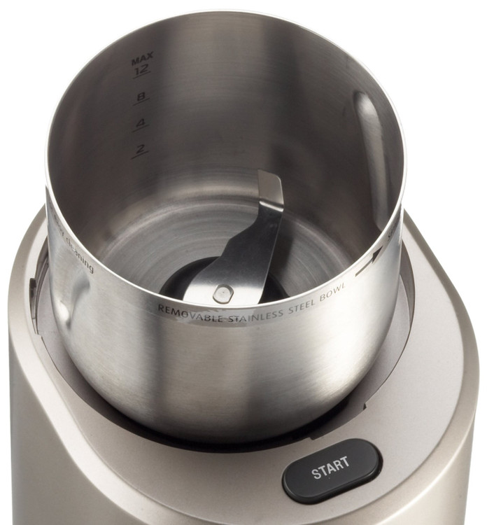 مخزن با ظرفیت 90 گرم قهوه آسیاب نشده، قابل جدا شدن جهت شستشو و تمیز کردن می باشد. این آسیاب قادر است قهوه و ادوبه جات را در 5 درجه مختلف پودر کند. جهت تهیه پودر قهوه، اندازه درشت مناسب قهوه دمی و قهوه های فیلتردار، متوسط برای فرنچ پرس (قهوه فرانسه) و ریز مخصوص تهیه اسپرسو است.